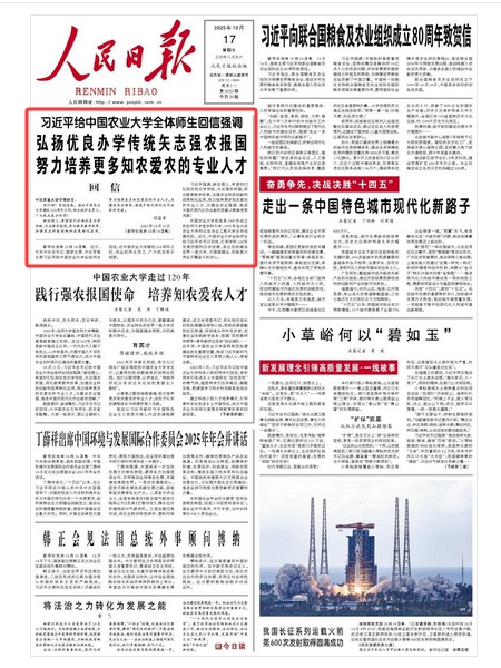 10月16日,國家主席習近平向聯合國糧食及農業組織成立80周年致賀信。